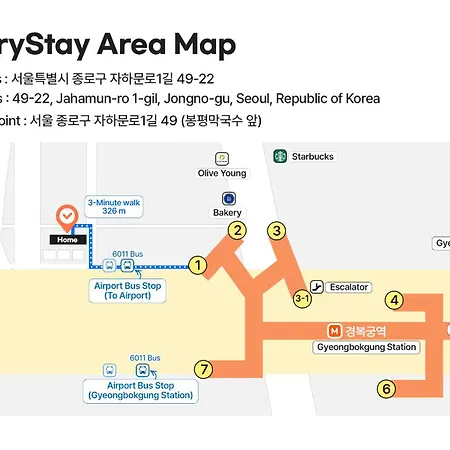 Апартаменты расположены в районе Seochon, совсем недалеко от дворца Кенбоккун. Расстояние до центра города составляет 4 км, а до аэропорта Кимпхо — 20 км. В 2 км от апартаментов находятся магазины красоты K-beauty.